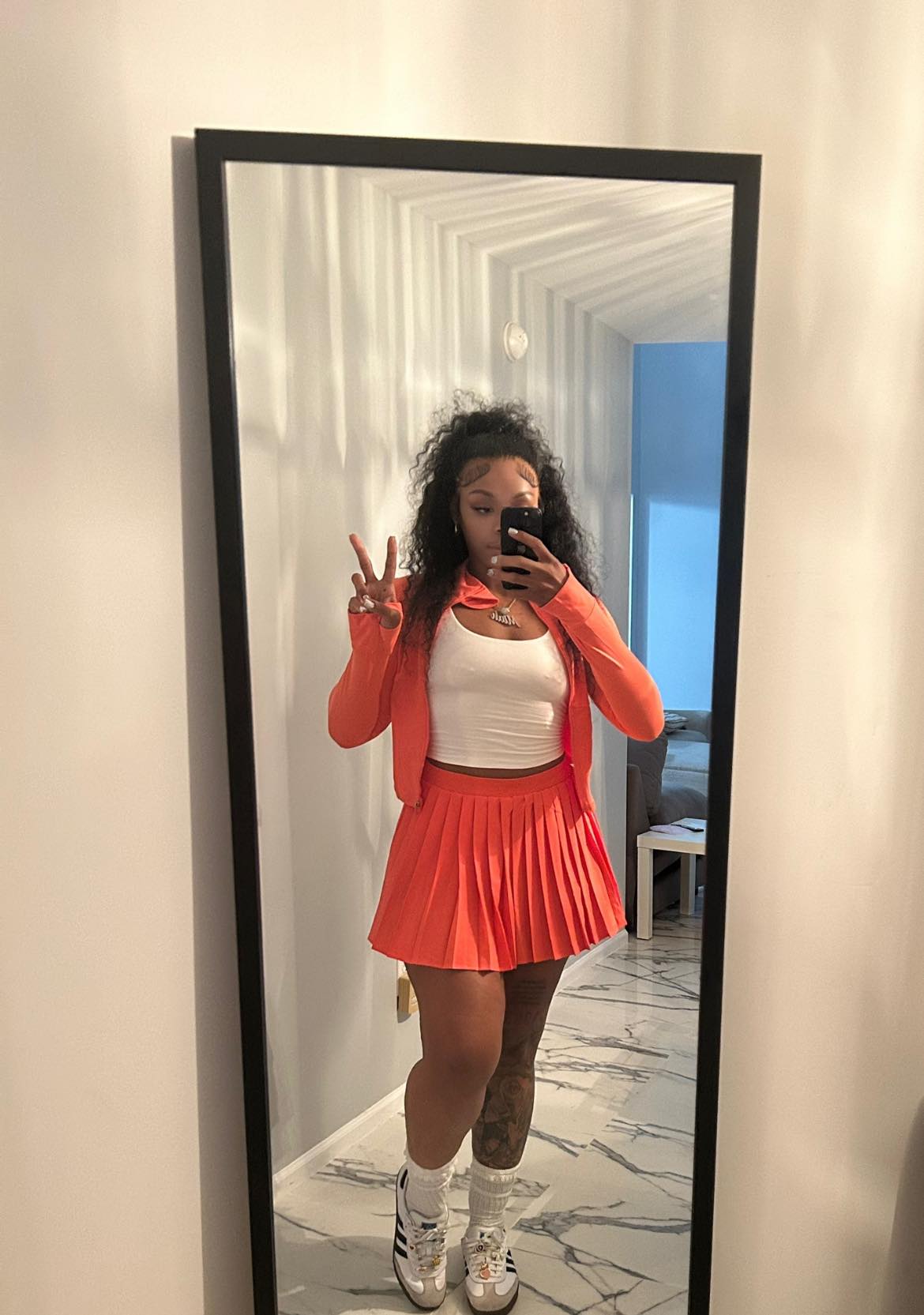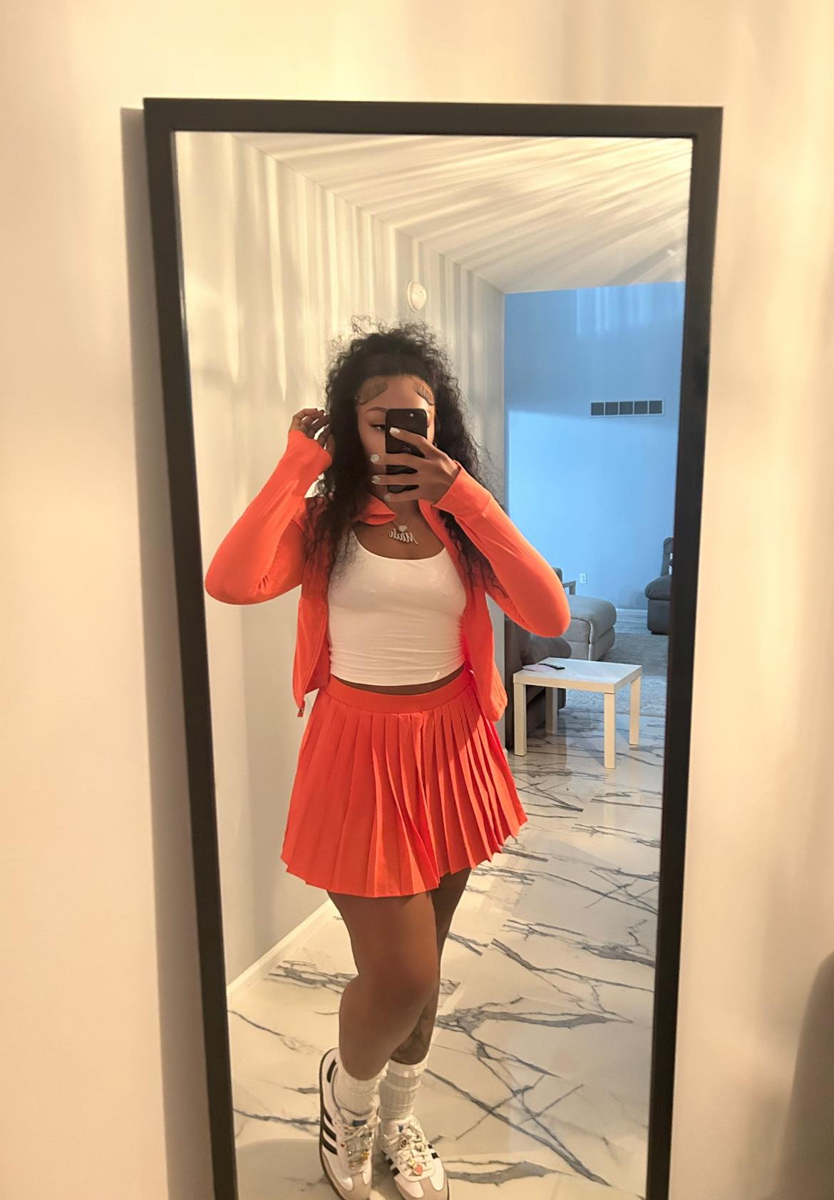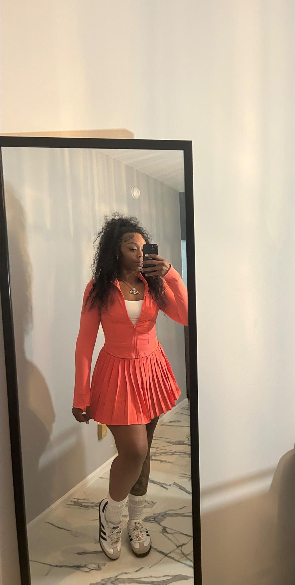 This 2pc Jacket and pleated skirt set is flirty and cute. Wear it to play pickleball, to the gym or for your weekend festivals. We love the stretch in this set. The model is wearing M (Height 5'9 weight 190).